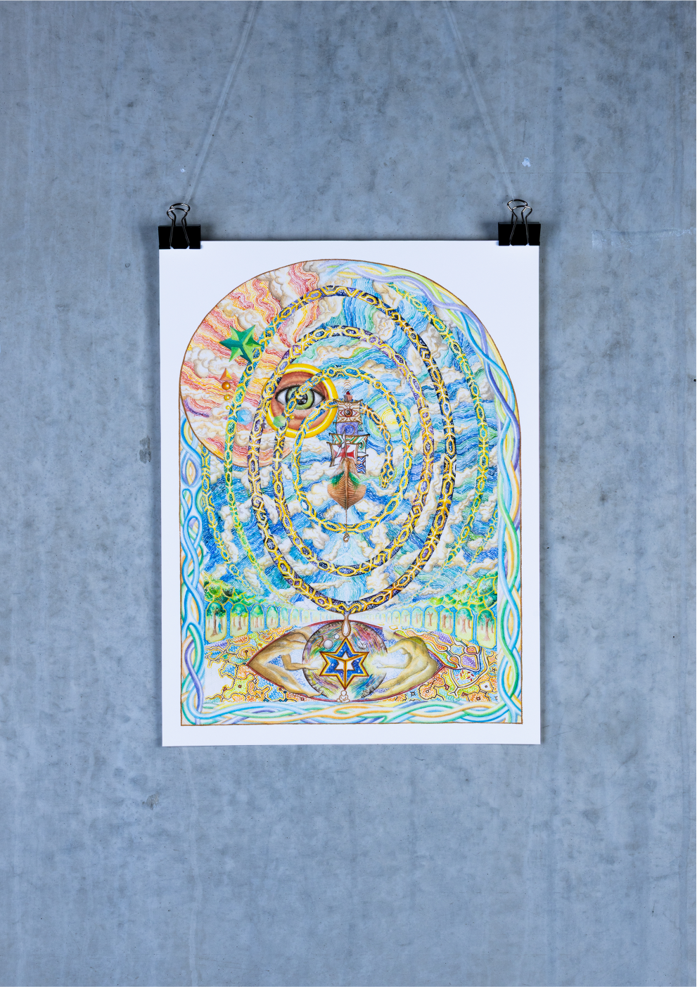 At the heart of this cosmic vision lies a vessel travelling through interstellar space and across dimensions. A luminous golden anaconda spirals around it, embodying protection and universal order. The serpent follows the rhythm of the Fibonacci sequence, a sacred pattern of growth, symmetry and creation that echoes throughout the universe.